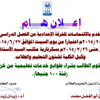 تبدأ التماسات لفرقة الإعدادية عن الفصل الدراسي الثاني 2014/2015م اعتباراً من يوم السبت الموافق 27/6/2015م.