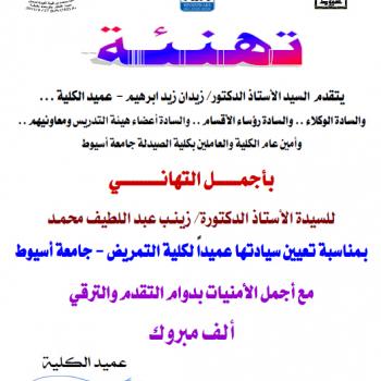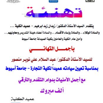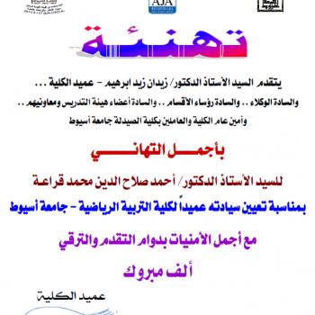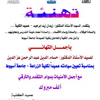 كلية الصيدلة تتقدم بخالص التهنئة للسيد الأستاذ الدكتور/ حسام الدين عبد الرحمن عز الدين بمناسبة تعيين سيادته عميداً لكلية الزراعة - جامعة أسيوط.
