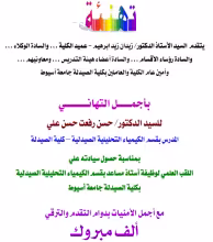 تهنئة للسيد الدكتور/ حسن رفعت حسن علي بمناسبة حصول سيادته علي اللقب العلمي لوظيفة أستاذ مساعد بقسم الكيمياء التحليلية الصيدلية بكلية الصيدلة جامعة أسيوط.