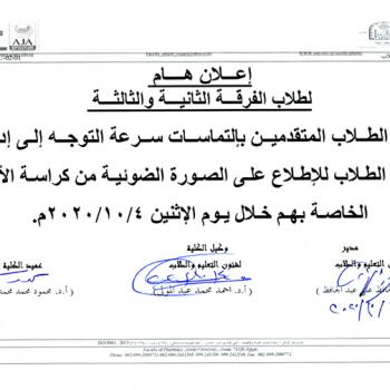 وافق مجلس كلية الصيدلة بجلسته رقم (691) المنعقدة بتاريخ 20/9/2020م علي تقدم السيد الصيدلي/ أحمد عبدالفتاح أحمد -…