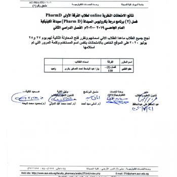 نتائج الامتحانات النظرية Online لطلاب الفرقة الأولي PharmD برنامج درجة بكالوريوس الصيدلة (Pharm D) وذلك للفصل الدراسي الثاني من العام الجامعي 2019-2020م.