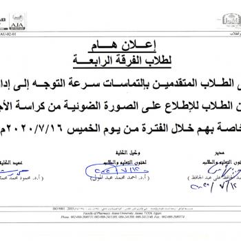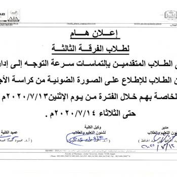 سوف يعقد بمشيئة الله تعالي اجتماع مجلس كلية الصيدلة يوم الأحد الموافق 19-7-2020م الساعة الحادية عشر صباحاً وذلك…