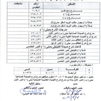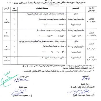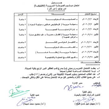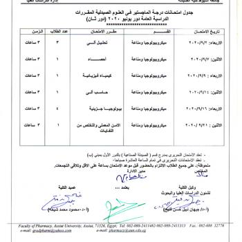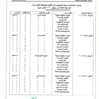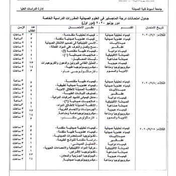 جدول امتحان درجة الماجستير في العلوم الصيدلية – المقررات الدراسية الخاصة – دور أول 2020م (بعد تغيير موعد الامتحان).