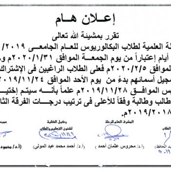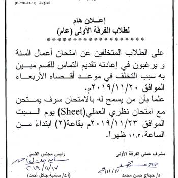 هام لطلاب الفرقة الأولي (عام) - المتخلفين عن امتحان السنة ويرغبون في إعادته سرعة تقديم التماس للقسم أقصاه الأربعاء الموافق 20-11-2019م.