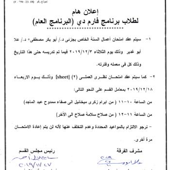 هام لطلاب برنامج فارم دي (البرنامج العام) .. امتحان أعمال السنة بجزيئه يوم الثلاثاء الموافق 3-12-2019م ، وامتحان نظري العملي (2) شيت يوم الأربعاء الموافق 18-12-2019م.