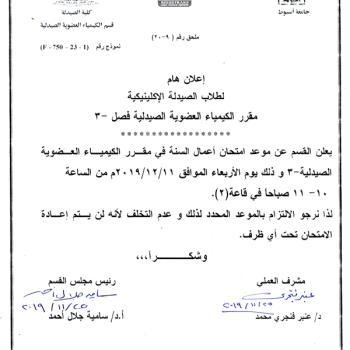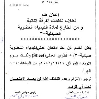 هام لطلاب الفرقة الثانية (تخلفات) ومن الخارج .. امتحان عملي لمقرر الكيمياء العضوية الصيدلية-3 وامتحان نظري العملي (شيت) يوم الأربعاء الموافق 11-12-2019م.