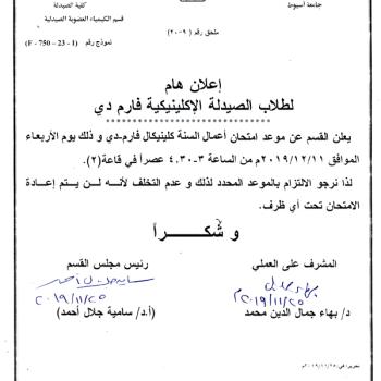 هام لطلاب الصيدلة الإكلينيكية (فارم دي) .. أمتحان أعمال السنة كلينيكال فارم دي يوم الأربعاء الموافق 11-12-2019م.