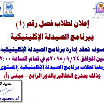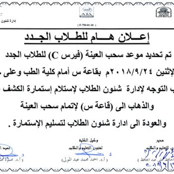 هام لطلاب كلية الصيدلة الجدد – تقرر سحب عينة فيروس سي يوم الاثنين 24-9-2018م.