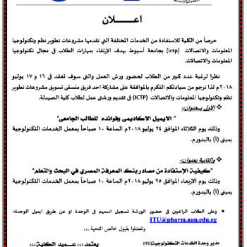 وحدة الخدمات التكنولوجية بكلية الصيدلة تعلن عن ورشتي عمل للطلاب .. الأولي بعنوان: الإيميل الأكاديمي وفوائده للطالب الجامعي ، والثانية بعنوان: كيفية الإستفادة من مصادر بنك المعرفة المصري في البحث…