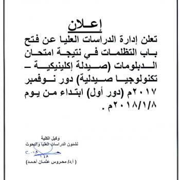 سوف يعقد بمشيئة الله تعالي اجتماع لجنة الدراسات العليا والبحوث بكلية الصيدلة يوم الأحد الموافق 14-1-2018م الساعة العاشرة…