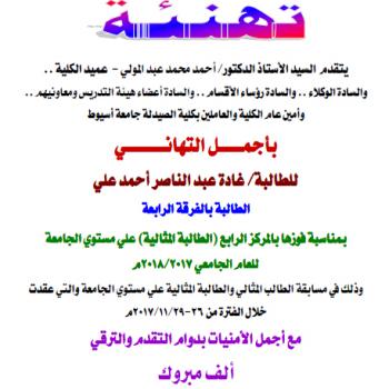 تهنئة للطالبة: غادة عبد الناصر أحمد علي بمناسبة حصولها علي المركز الرابع (الطالبة المثالية) علي مستوي الجامعة للعام الجامعي 2017-2018م.