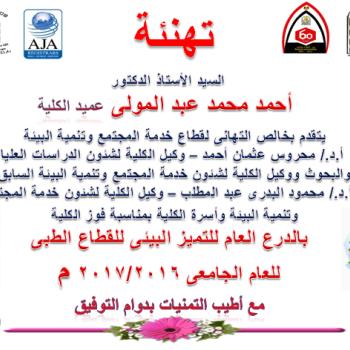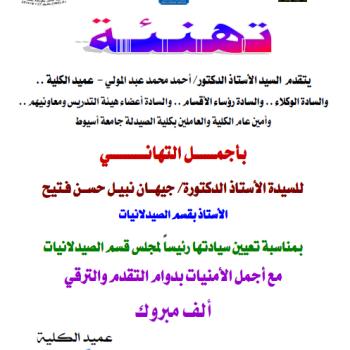 عميد الكلية وأعضاء هيئة التدريس ومعاونيهم والعاملين بكلية الصيدلة جامعة أسيوط ينعون ببالغ الحزن والأسى