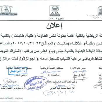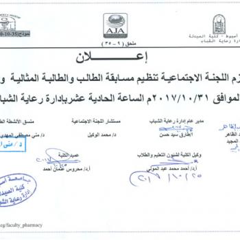 سوف يعقد بمشيئة الله تعالي اجتماع مجلس كلية الصيدلة يوم الاثنين الموافق 23-10-2017م الساعة الحادية عشر صباحاً وذلك بمقر مجلس الكلية – الدور الخامس (…