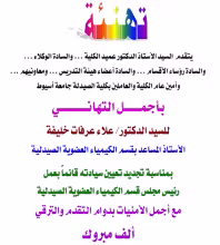 كلية الصيدلة تتقدم بخالص التهنئة للسيد الدكتور/ علاء عرفات خليفة بمناسبة تجديد تعيين سيادته قائماً بعمل رئيس مجلس قسم الكيمياء العضوية الصيدلية ، وللدكتور/ محمود فهمي علي الصبحي بمناسبة تعيين سيادته نائباً لمدير مركز بحوث الدواء.