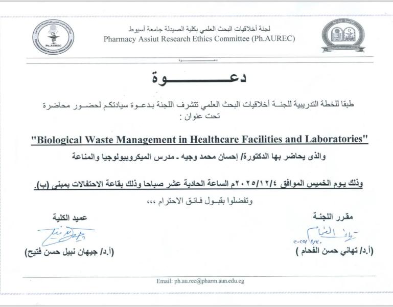 لجنة أخلاقيات البحث العلمي بكلية الصيدلة جامعة أسيوط بعنوان "Biological Waste Management in Healthcare Facilities and Laboratories" 3 ديسمبر 2025