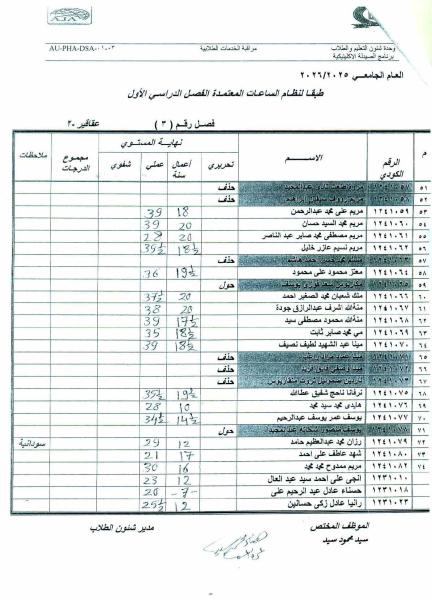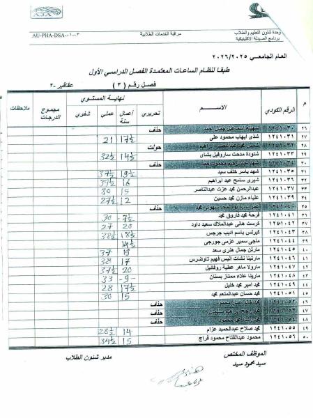 درجات اعمال السنة والعملي لمقرر عقاقير-2 لطلاب فصل 3 الفصل الدراسي الأول للعام الجامعى 2025/2026 21 ديسمبر 2025