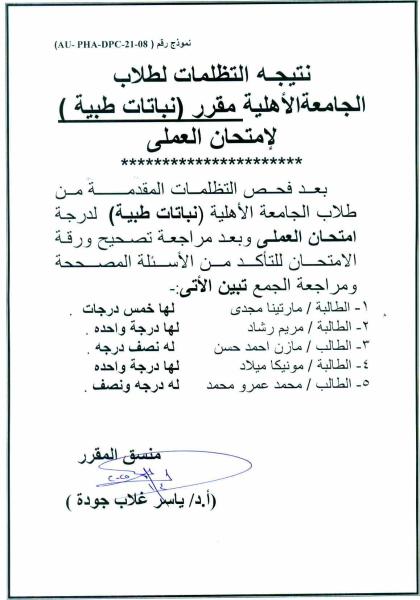 نتيجة التظلمات لطلاب الجامعة الأهلية مقرر نباتات طبية لإمتحان العملى