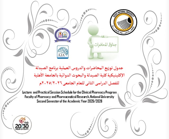 جدول توزيع المحاضرات والدروس العملية برنامج الصيدلة الإكلينيكية كلية الصيدلة والبحوث الدوائية بالجامعة الأهلية للفصل الدراسى الثانى للعام الجامعى 2025/2026م