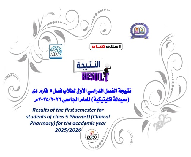 نتيجة الفصل الدراسي الأول لطلاب فصل 5 فارم دى (صيدلة اكلينيكية) للعام الجامعى 2025/2026م 2 فبراير 2026 اضغط👇لينك الدخول