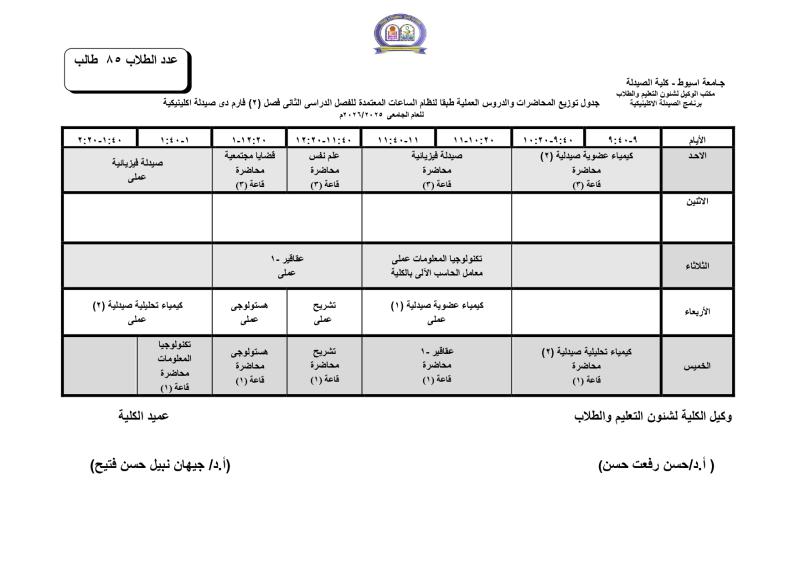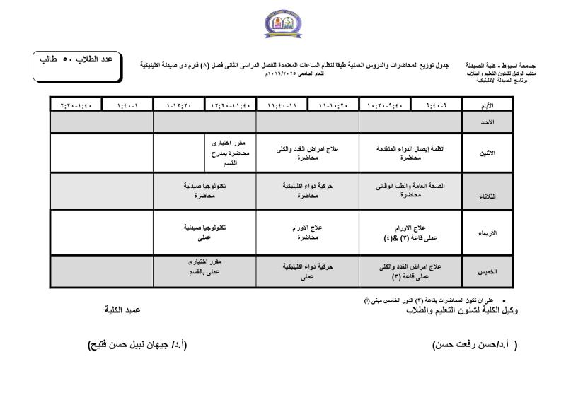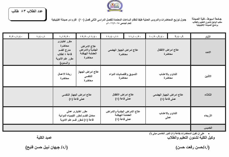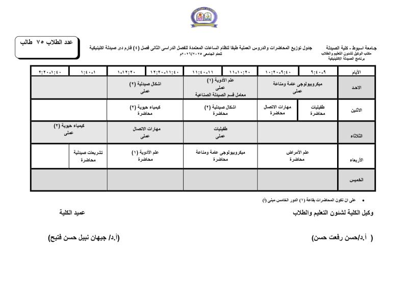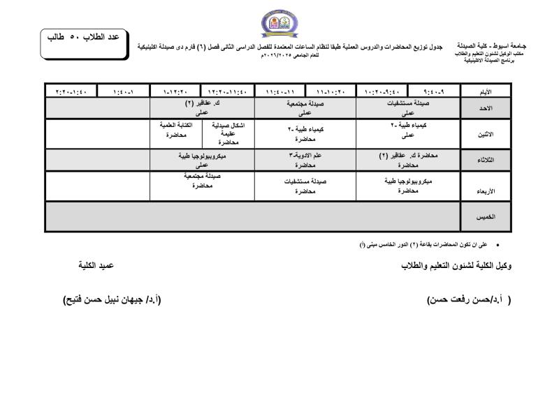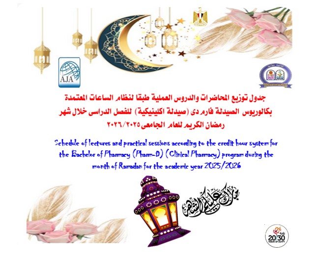 جدول توزيع المحاضرات والدروس العملية طبقا لنظام الساعات المعتمدة بكالوريوس الصيدلة فارم دى (صيدلة اكلينيكية) للفصل الدراسى خلال شهر رمضان الكريم للعام الجامعى 2026/2025