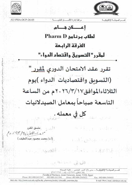 إعلان لطلاب الفرقة الرابعة عن موعد الامتحان الدوري لمقرر التسويق واقتصاديات الدواء