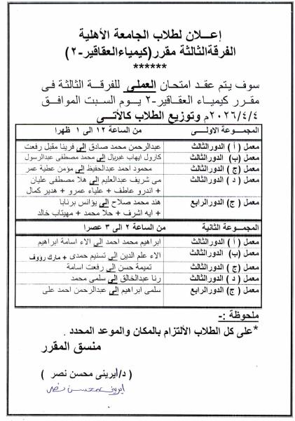 إعلان لطلاب الجامعة الأهلية الفرقة الثالثة موعد امتحان مقرر كيمياء العقاقير- 2 يوم السبت الموافق 4/4/2026م 1 أبريل 2026