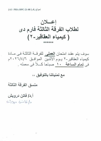 هام لطلاب الفرقة الثالثة (فارم دي): موعد الامتحان العملي لمادة كيمياء العقاقير (2). يوم الاثنين الموافق 6/4/2026م 1 أبريل 2026