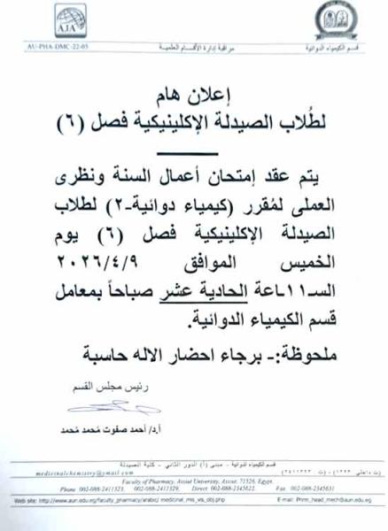 موعد امتحان أعمال السنة والنظري العملي لمقرر الكيمياء الدوائية (2) لطلاب الصيدلة الإكلينيكية (فصل 6) يوم الخميس الموافق 9/4/2026 1 أبريل 2026