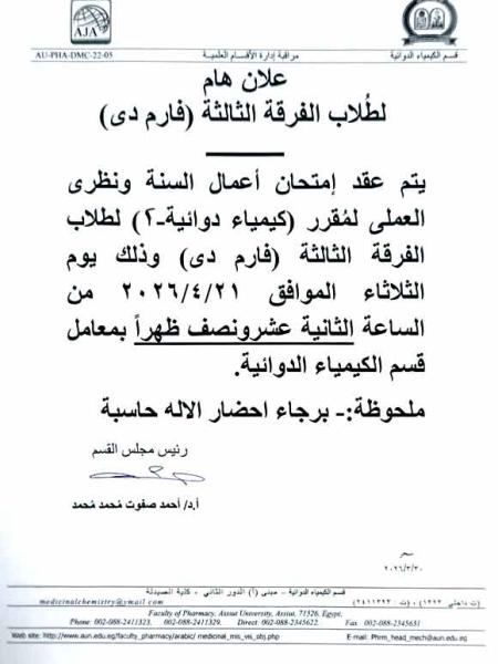 تنبيه لطلاب الفرقة الثالثة (فارم دي) بخصوص امتحان أعمال السنة والنظري العملي لمقرر الكيمياء الدوائية (2). وذلك يوم الثلاثاء الموافق 21/4/2026 1 أبريل 2026