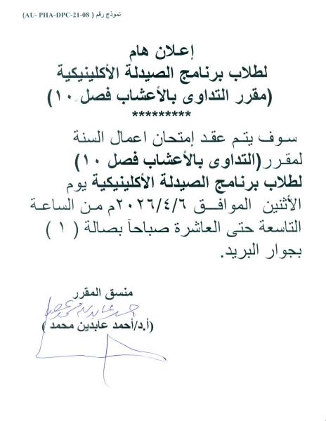 موعد امتحان اعمال السنه لمقرر التداوي بالأعشاب لطلاب برنامج الصيدلة الإكلينيكية - المستوى الخامس فصل 10 يوم الاثنين الموافق 6/4/2026م 1 أبريل 2026