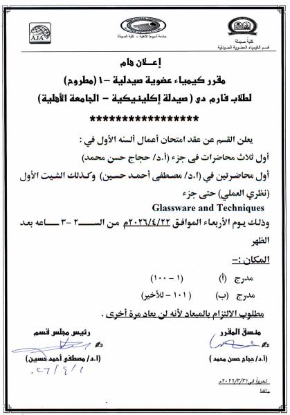 إعلان هام لطلاب فارم دي (صيدلة إكلينيكية – الجامعة الأهلية) مقرر كيمياء عضوية صيدلية – 1 (مطروح) وذلك يوم الأربعاء الموافق 22 ابريل 2026م 3 أبريل 2026