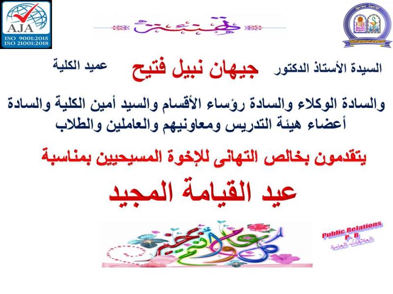 إدارة الكلية تهنئ الأخوة المسيحيين بمناسبة عيد القيامة المجيد.
