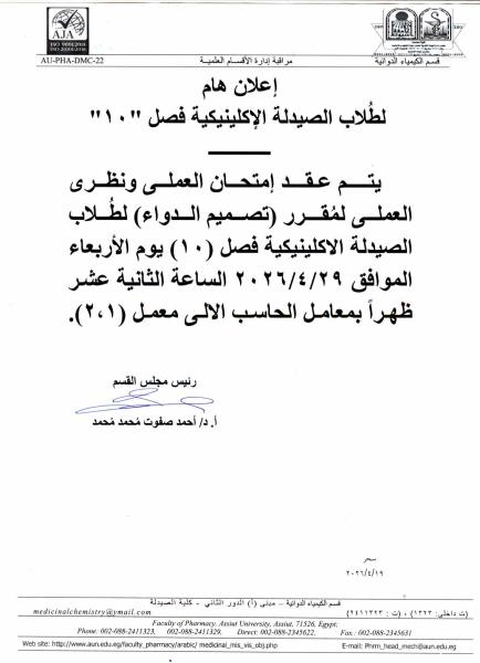 إعلان هام لطلاب الصيدلة الاكلينيكية فصل(10) عقد امتحان العملى ونظري العملي لمقرر تصميم الدواء 20 أبريل 2026