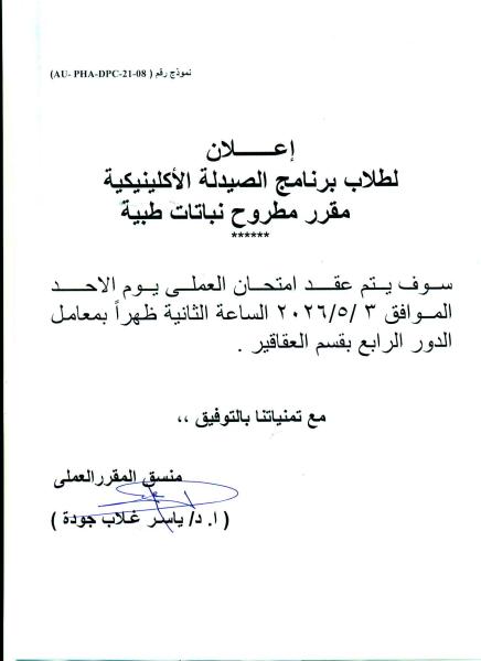 إعلان هام لطلاب الصيدلة الاكلينيكية فصل(10) عقد امتحان العملى ونظري العملي لمقرر تصميم الدواء