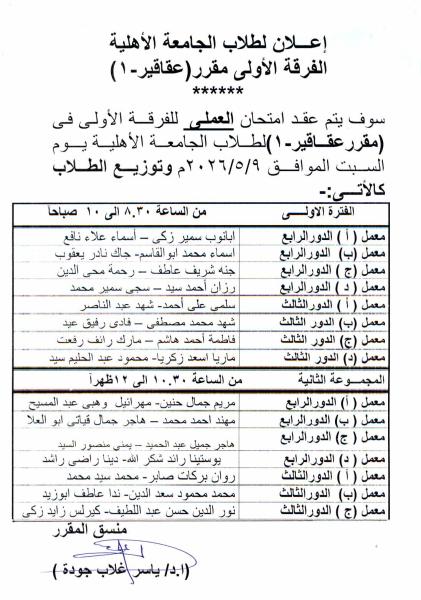 إعلان لطلاب الفرقة الأولى الجامعة الأهلية توزيع أماكن الطلاب في إمتحان العملى لمقرر عقاقير-1 يوم السبت الموافق 9 مايو 2026 م 27 أبريل 2026