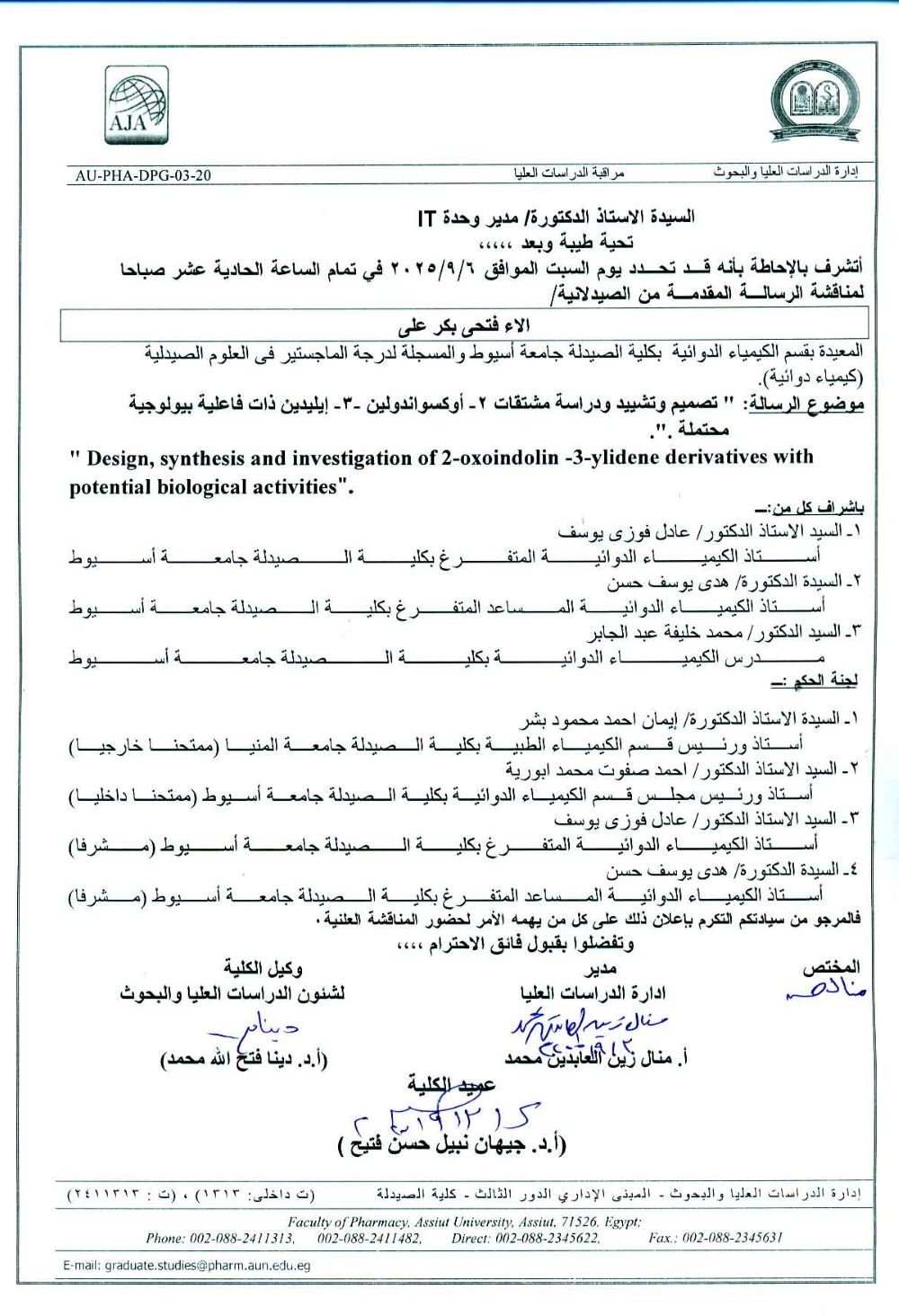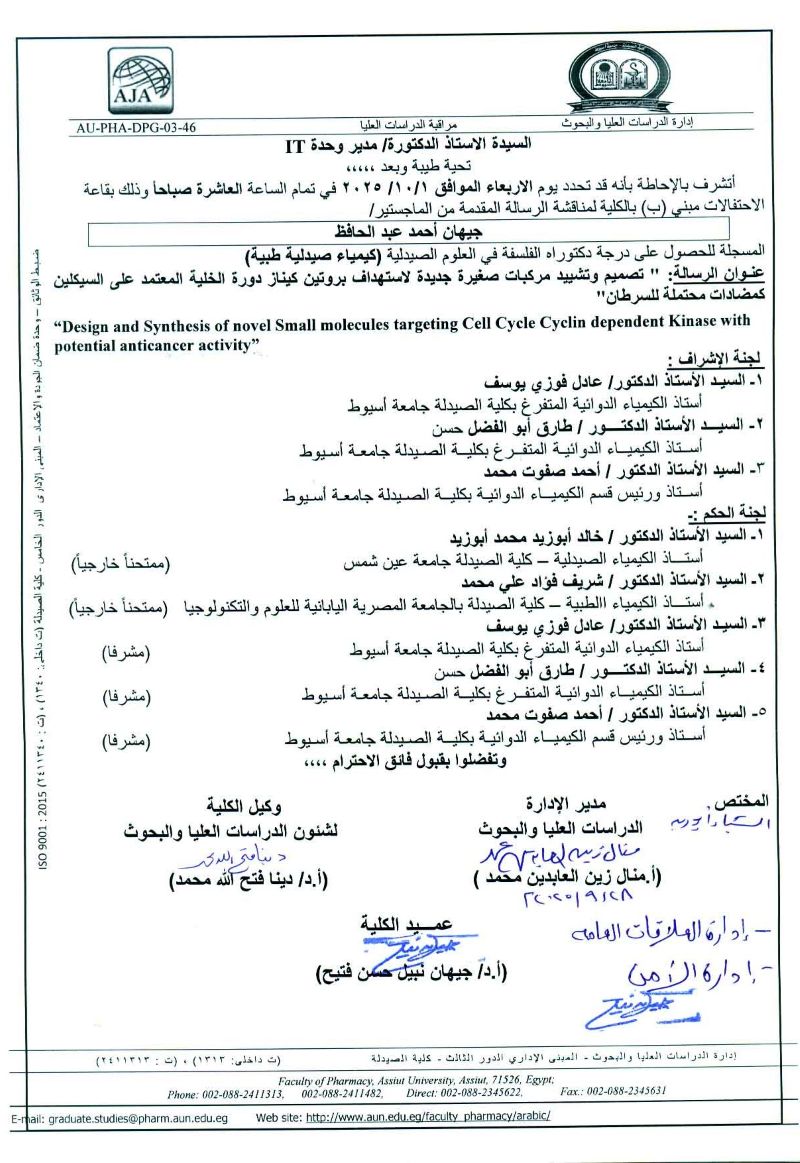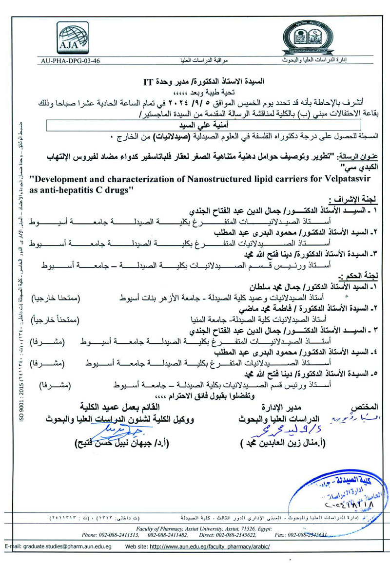 مناقشة رسالة الدكتوراه المقدمة من السيدة الماجستير / امنية علي السيد لنيل درجة دكتوراه الفلسفة في العلوم الصيدلية(صيدلانيات ) (من الخارج) يوم الخميس 5 سبتمبر 2024