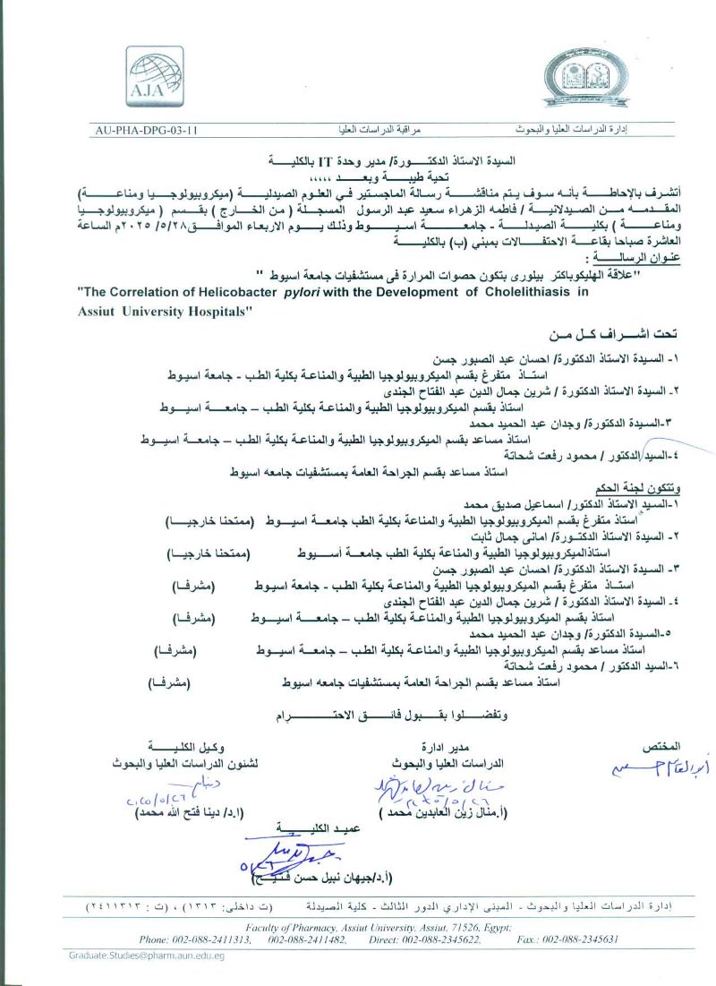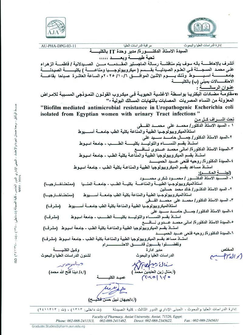 مناقشة رسالة الماجستير فى العلوم الصيدلية المقدمة من الصيدلانية/ فاطمه الزهراء سعيد عبدالرسول- المسجلة (من الخارج) قسم (ميكروبيولوجيا ومناعة)يوم الاربعاء الموافق 28 مايو 2025