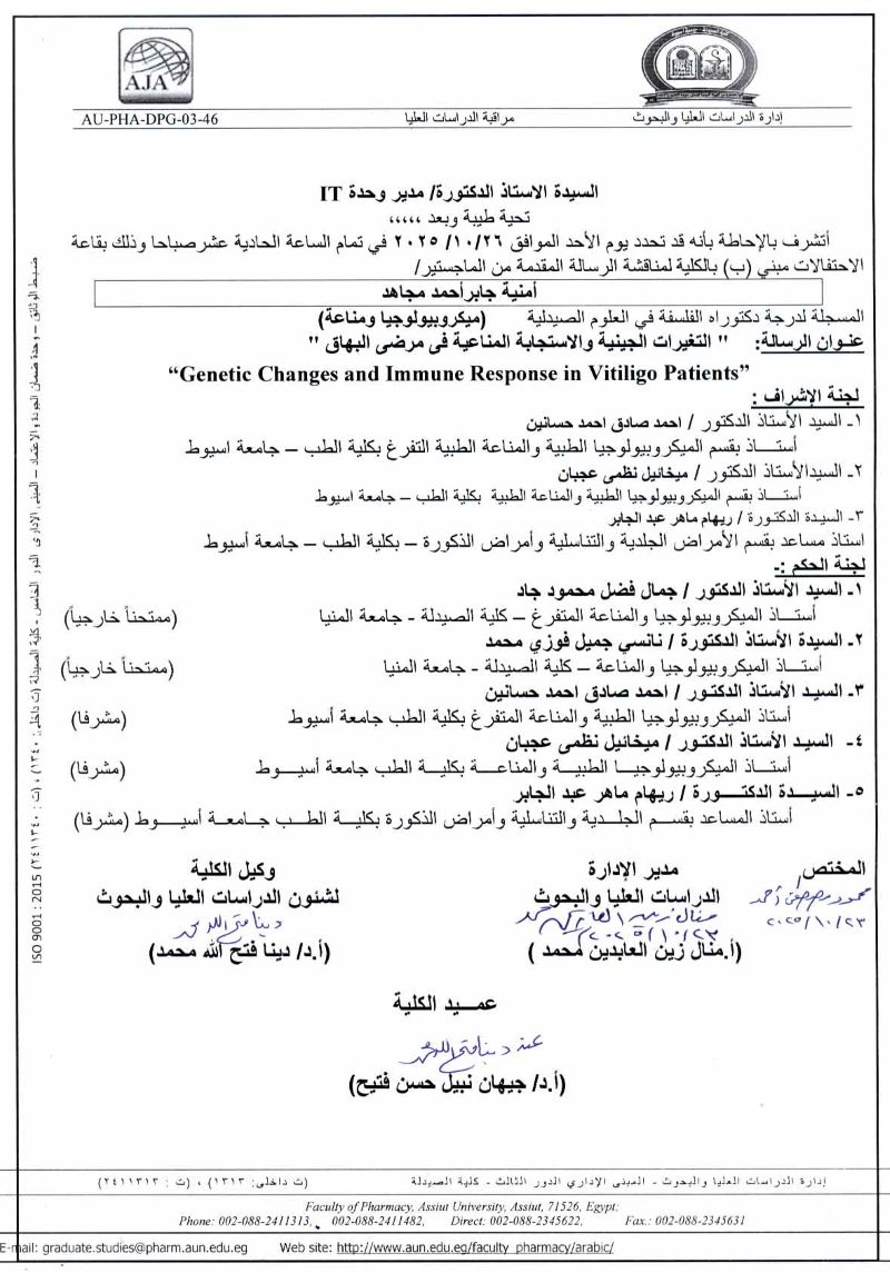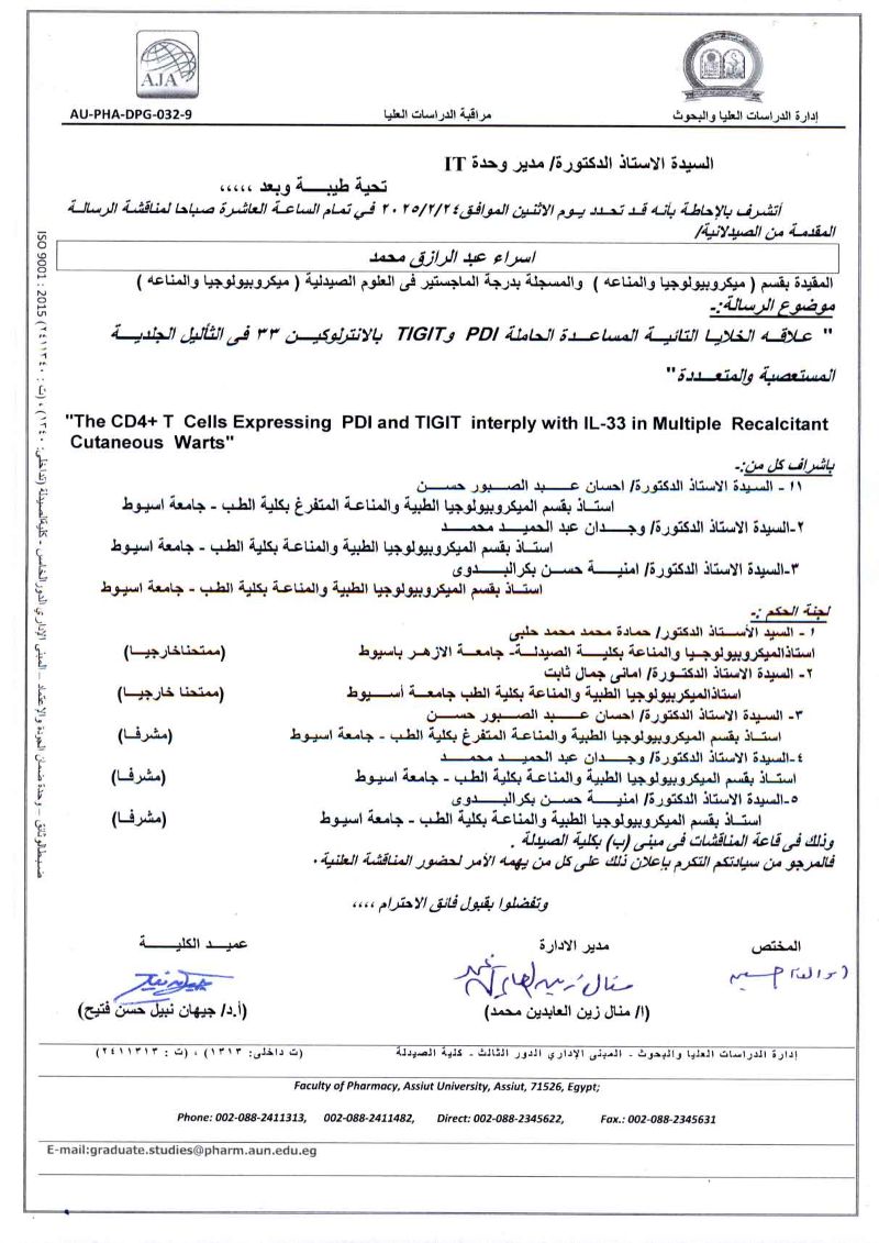 مناقشة الرسالة المقدمة من الماجستير / أمنية جابر احمد مجاهد - المسجلة لدرجة دكتوراه الفلسفة في العلوم الصيدلية (ميكروبيولوجيا ومناعة) يوم الأحد 26 أكتوبر 2025