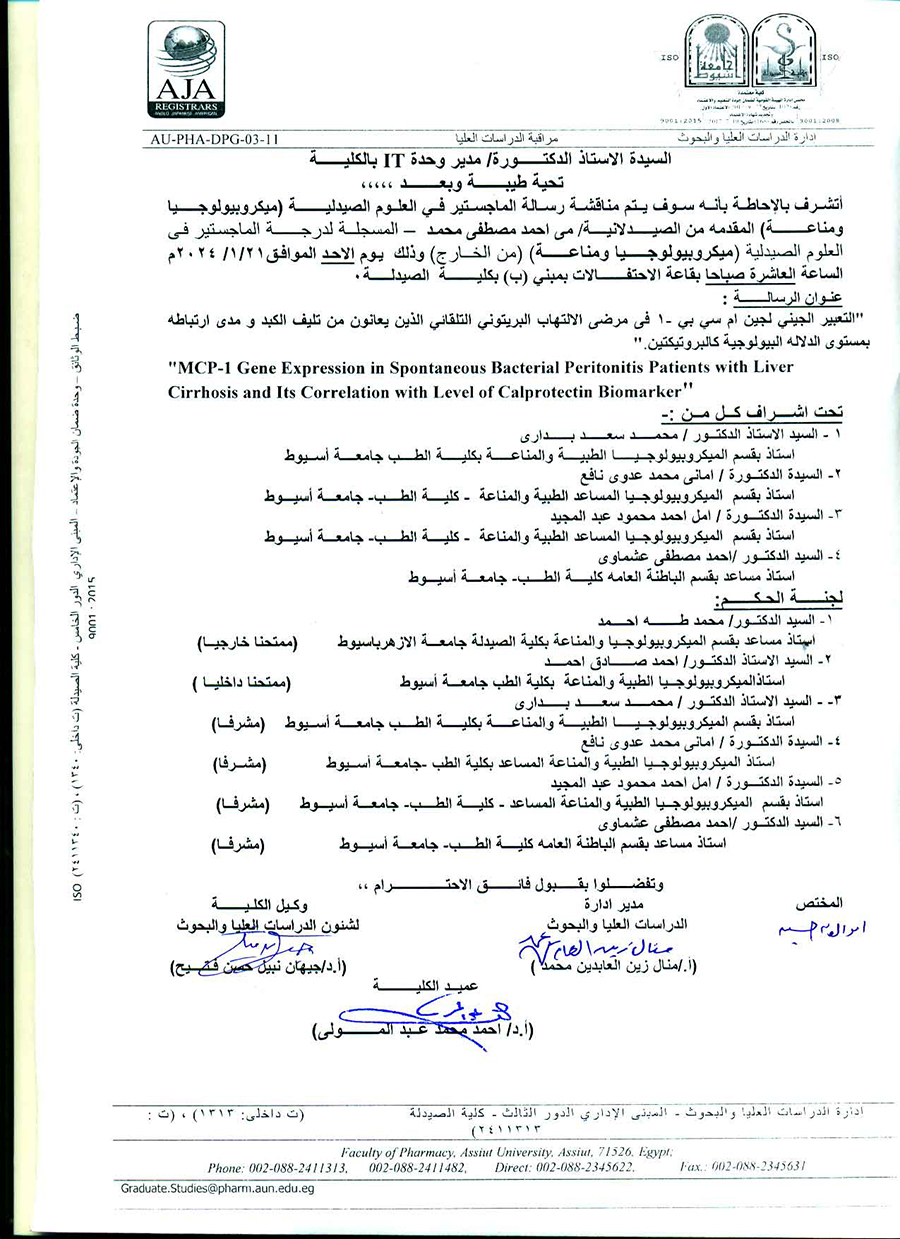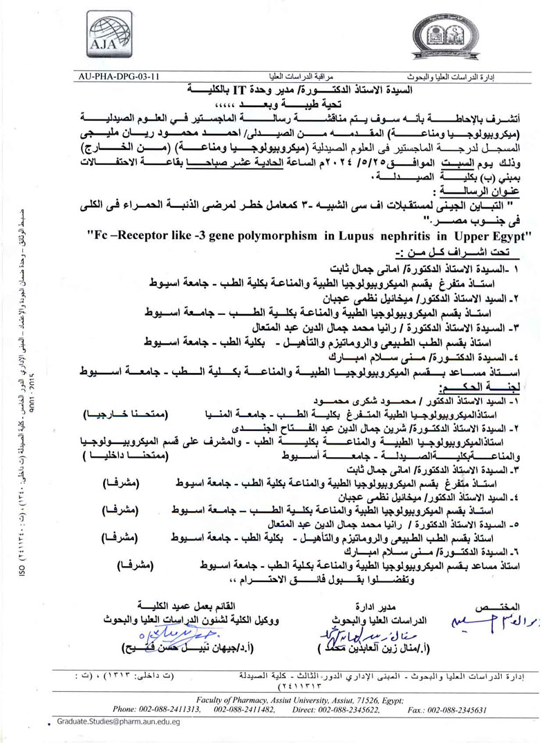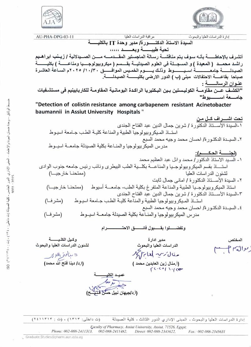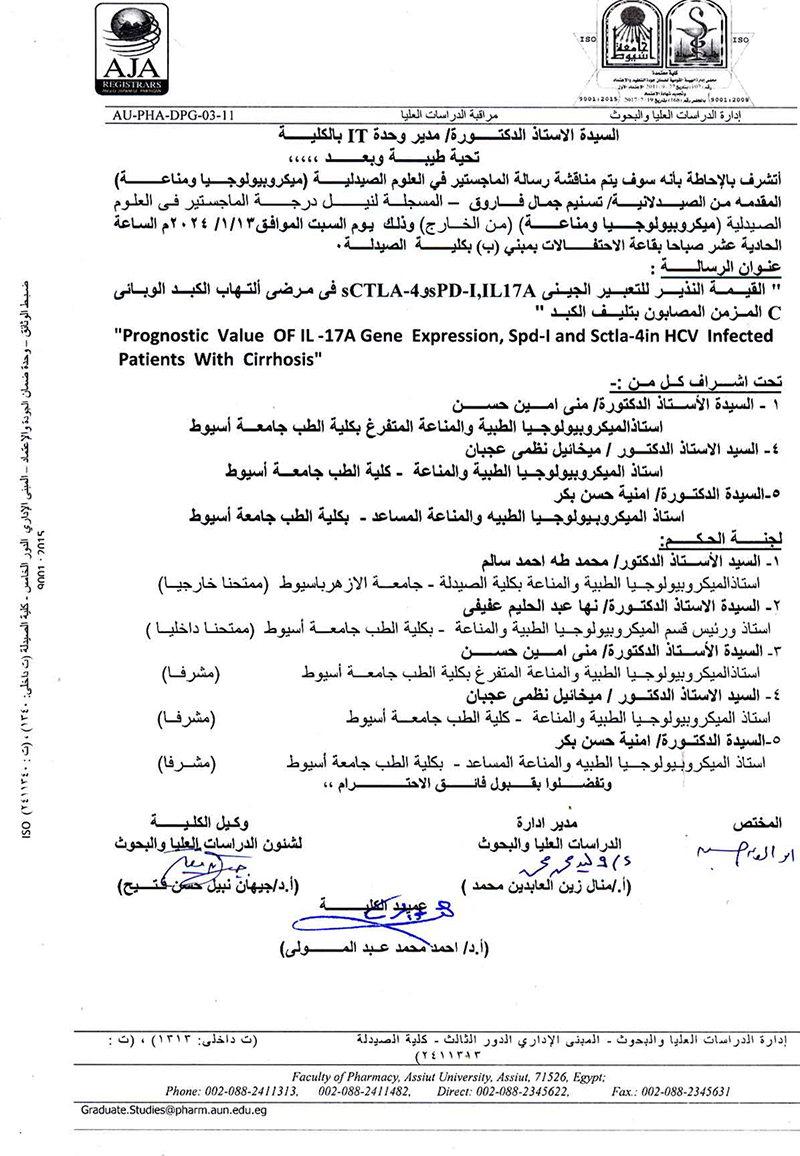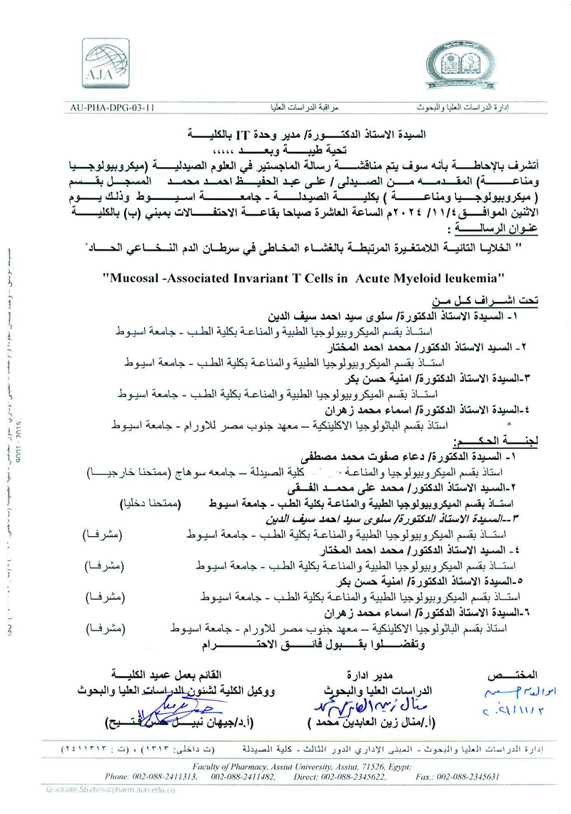 مناقشة رسالة الماجستير فى العلوم الصيدلية المقدمة من الصيدلى / على عبدالحفيظ احمد محمد المسجل بقسم (ميكروبيولوجيا ومناعة ) بكلية الصيدلة جامعة اسيوط يوم الاثنين الموافقة 4 نوفمبر 2024