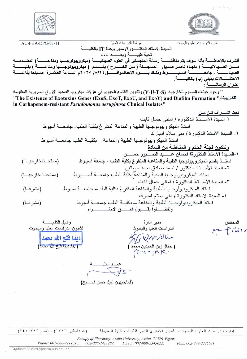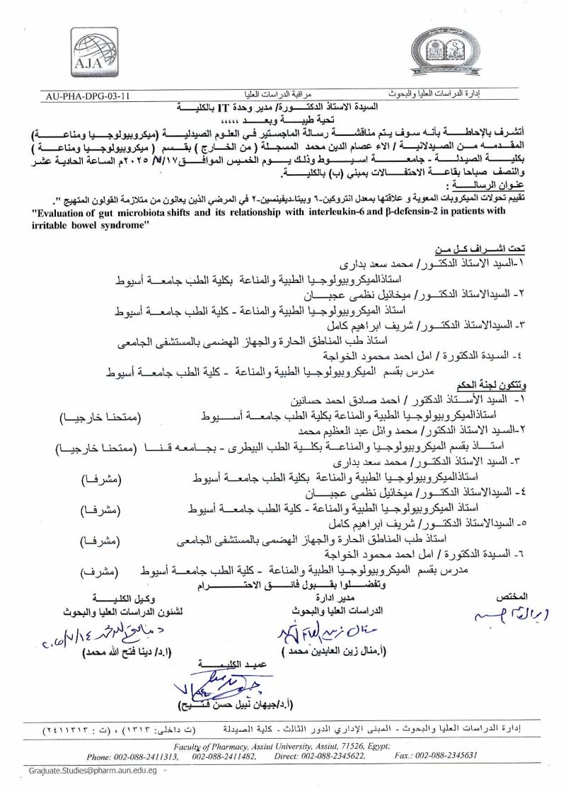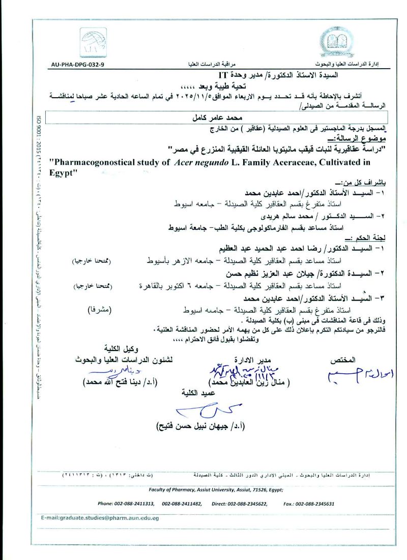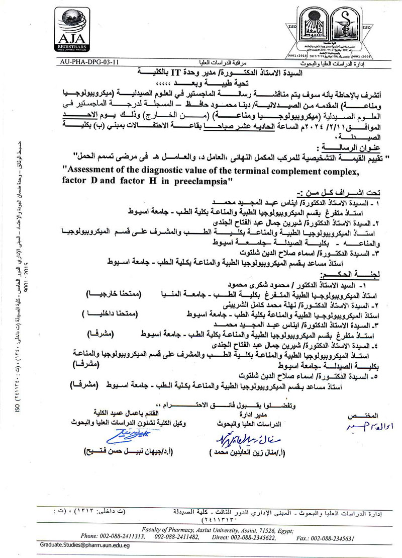 مناقشة رسالة الماجستير فى العلوم الصيدلية المقدمة من الصيدلى / على عبدالحفيظ احمد محمد المسجل بقسم (ميكروبيولوجيا ومناعة ) بكلية الصيدلة جامعة اسيوط يوم الاثنين الموافقة 4 نوفمبر 2024