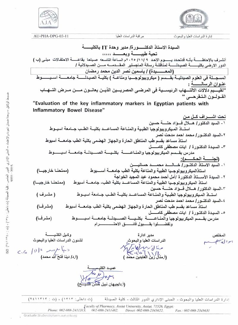 ممناقشة رسالة الماجستير المقدمة من الصيدلانية/ خديجه نشات اسماعيل زيادة المسجلة بقسم ميكروبيولوجيا ومناعة من الخارج وذلك يوم الأثنين الموافق 1 سبتمبر 2025
