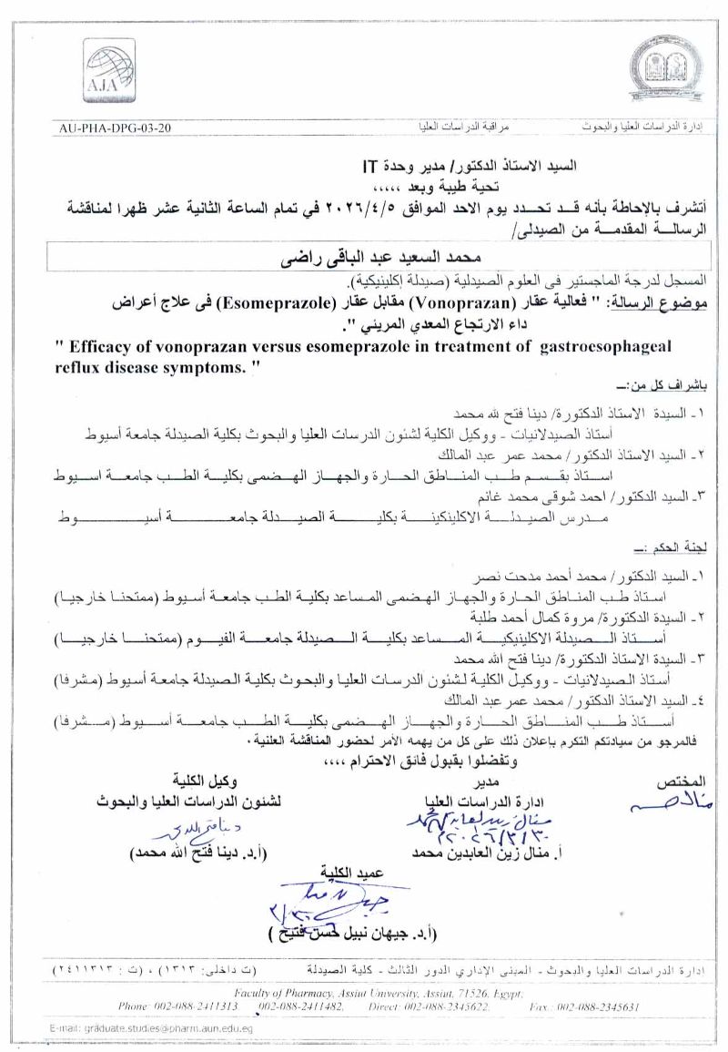 رسالة مقدمة من الصيدلى/ محمد السعيد عبدالباقى راضي المسجل لدرجة الماجستير فى العلوم الصيدلية (صيدلة اكلينيكية) يوم الأحد الموافق 5 ابريل 2026