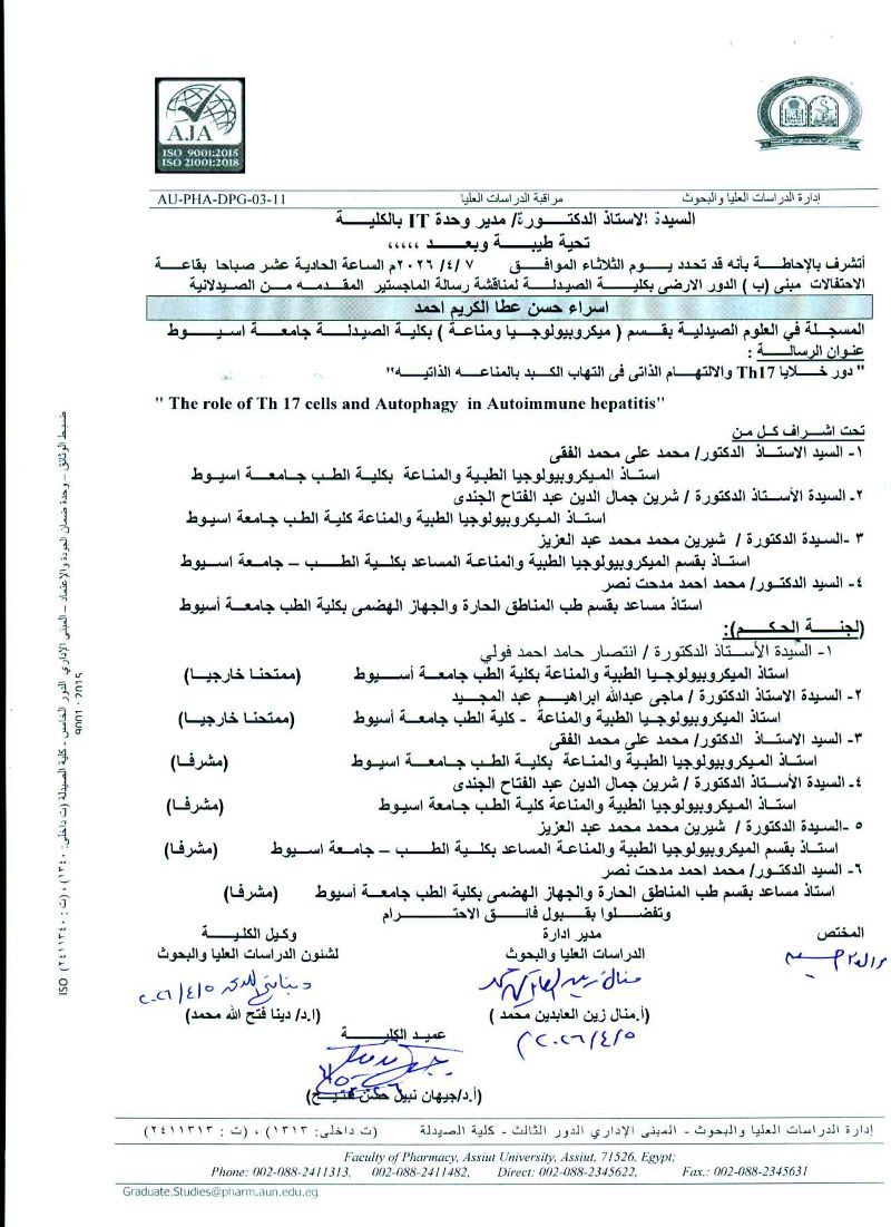 رسالة مقدمة من الصيدلانية / اسراء حسن عطا الكريم احمد راضي المسجل لدرجة الماجستير فى العلوم الصيدلية (ميكروبيولوجيا ومناعة ) يوم الثلاثاء الموافق 7 ابريل 2026