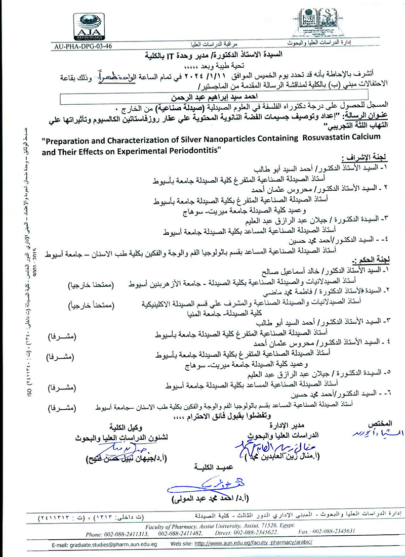 مناقشة الرسالة المقدمة من الماجستير / احمد سيد ابراهيم عبد الرحمن المسجل للحصول على درجة الدكتوراه فى العلوم الصيدلية (صيدلة صناعية ) من الخارج يوم الخميس الموافق 11 يناير 2024