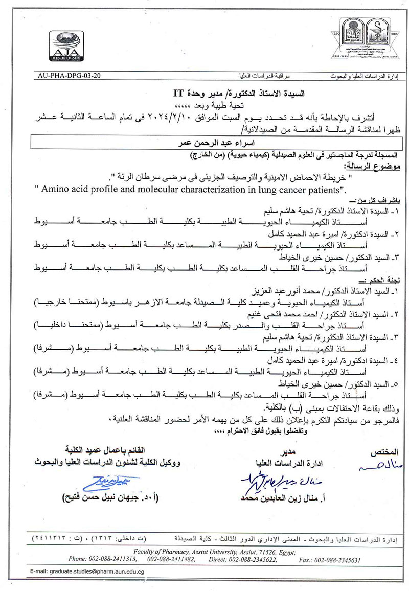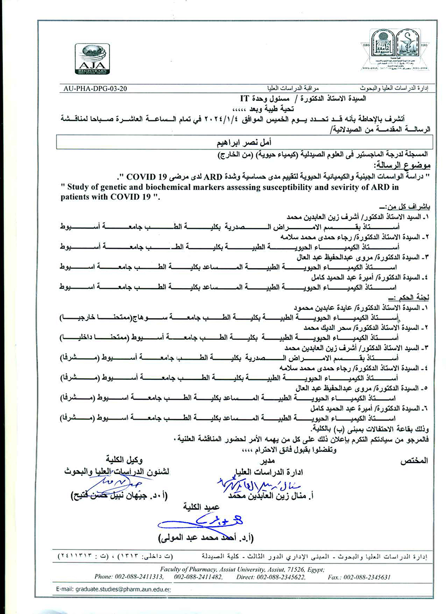 مناقشة الرسالة المقدمة من الصيدلانية / امل نصر ابراهيم المسجلة لدرجة الماجستير فى العلوم الصيدلية (كيمياء حيوية ) من الخارج يوم الخميس الموافق 4 يناير 2024