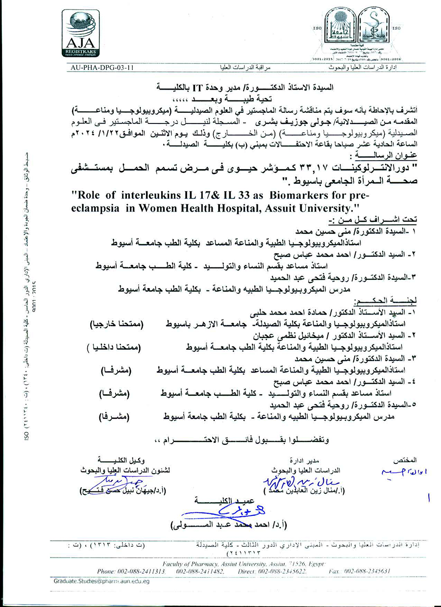 مناقشة الرسالة المقدمة من الصيدلانية / جولى جوزيف بشرى المسجلة للحصول على درجة الماجستير في العلوم الصيدلية (ميكروبيولوجيا ومناعة )(من الخارج) يوم الاثنين الموافق 22 يناير 2024