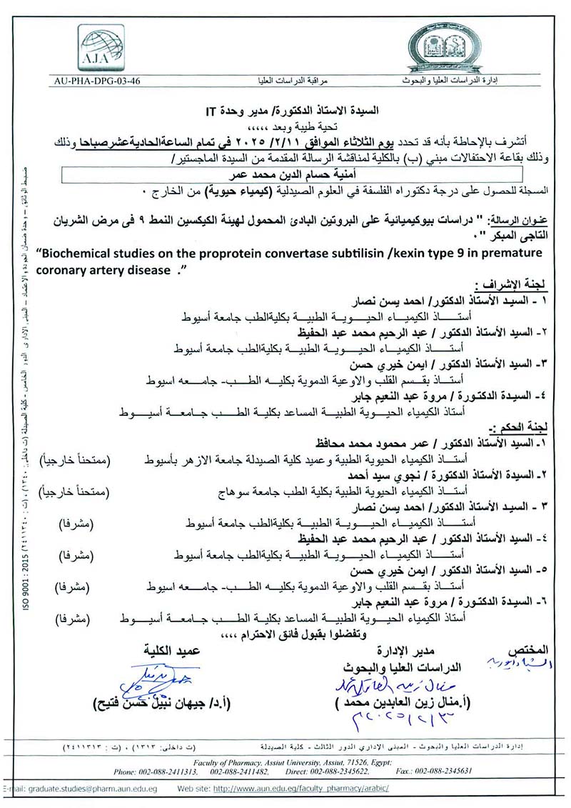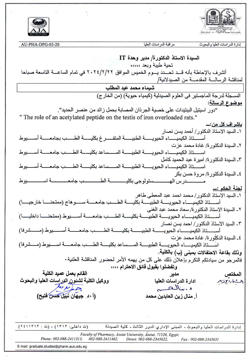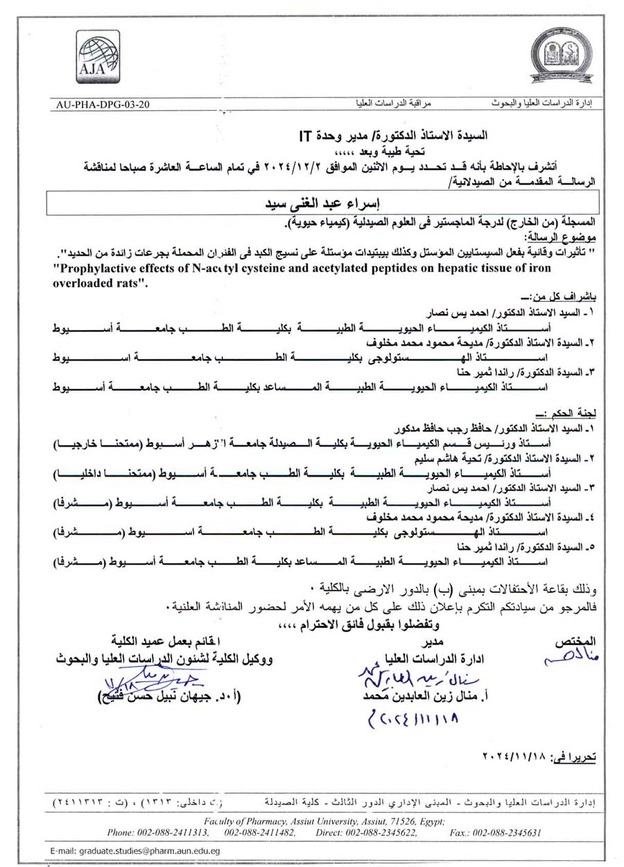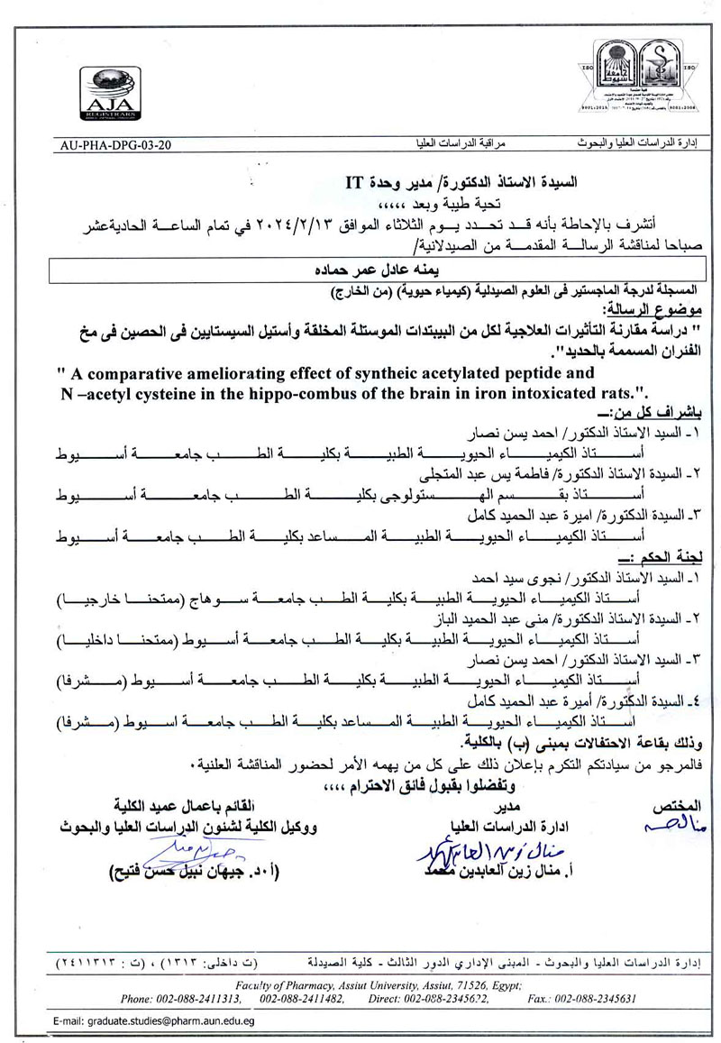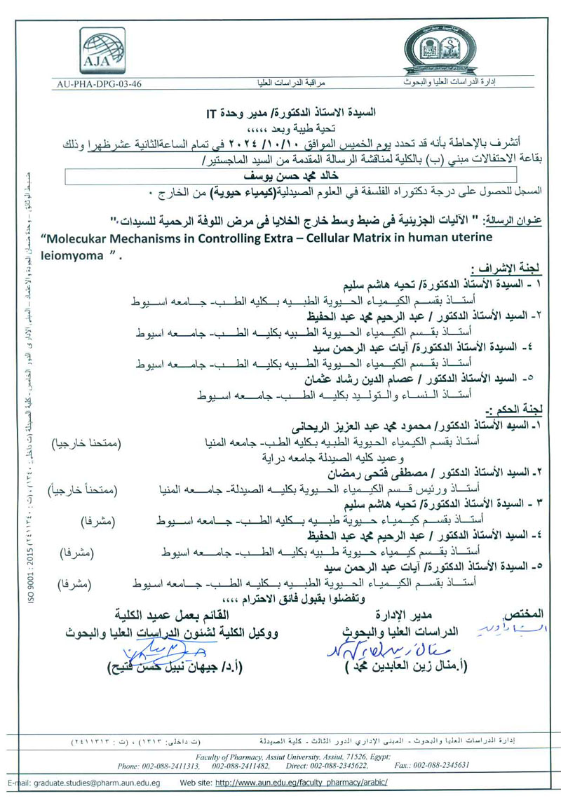 مناقشة الرسالة المقدمة من السيد الماجستير / خالد محمد حسن للحصول على درجة دكتوراه الفلسفة فى العلوم الصيدلية (كيمياء حيوية ) من الخارج يوم الخميس الموافق 10/ اكتوبر/2024