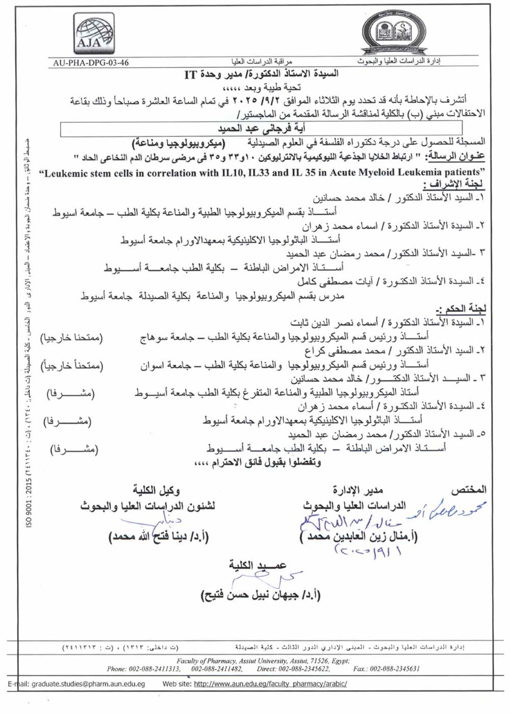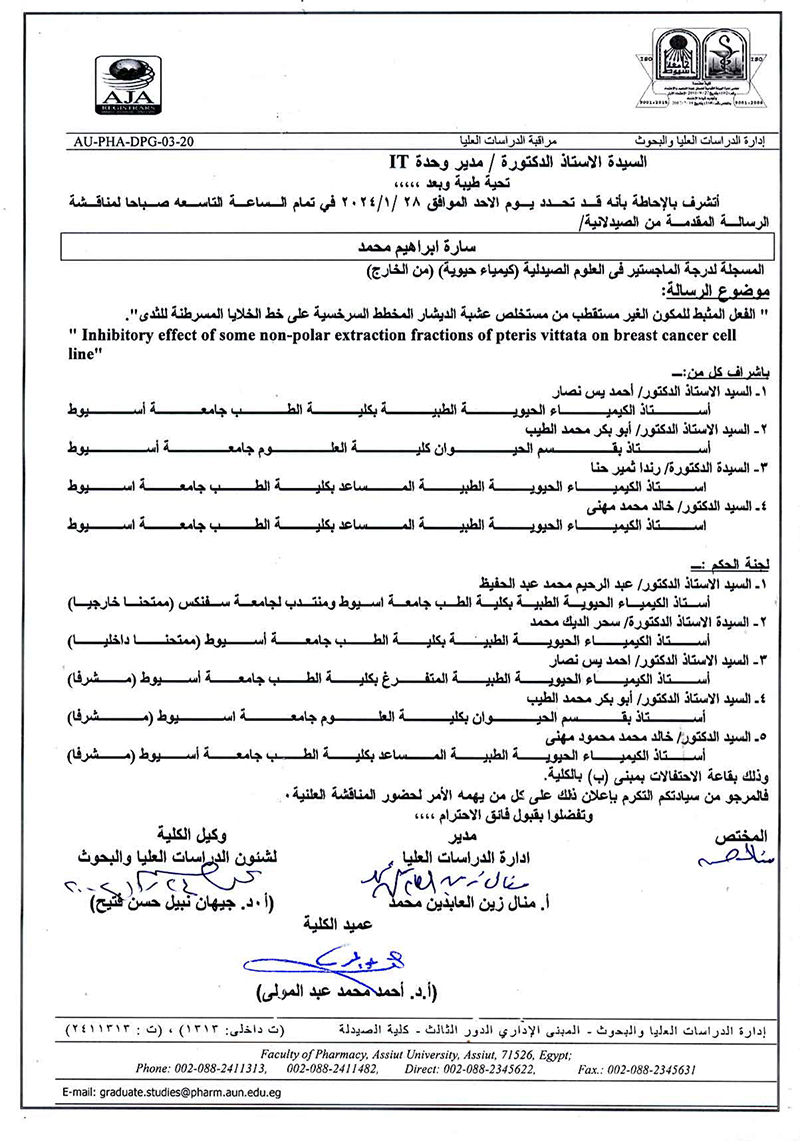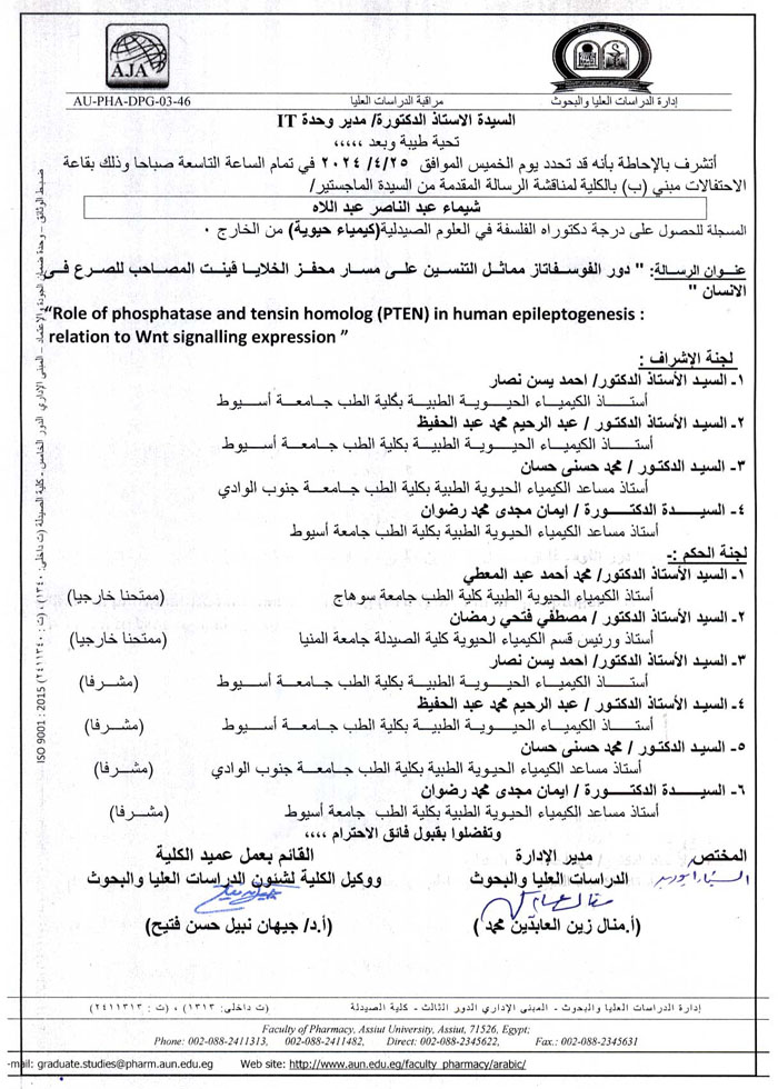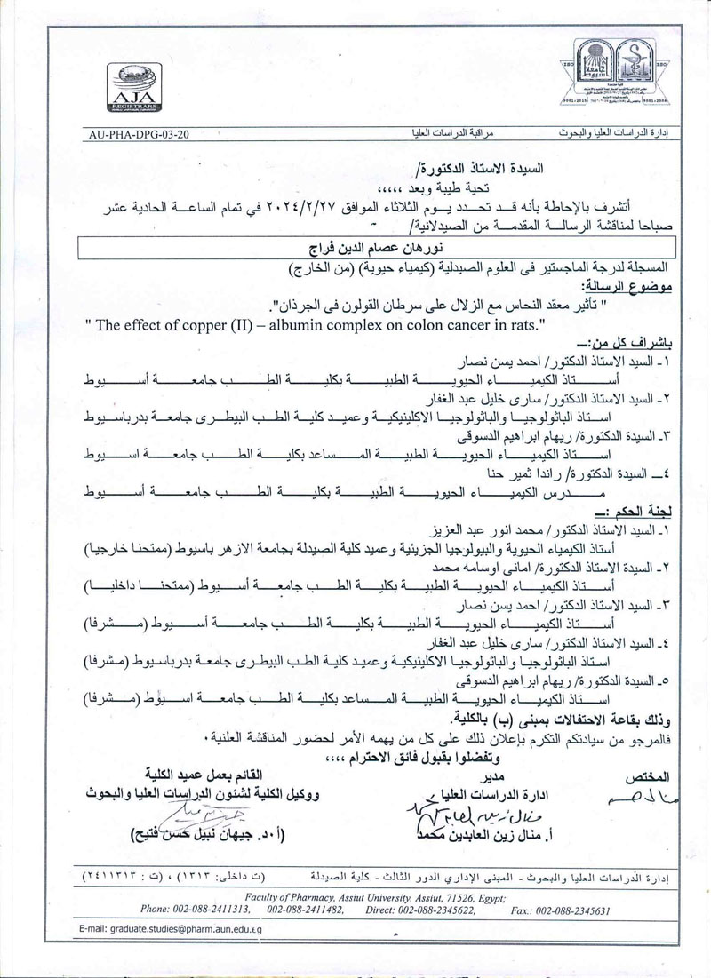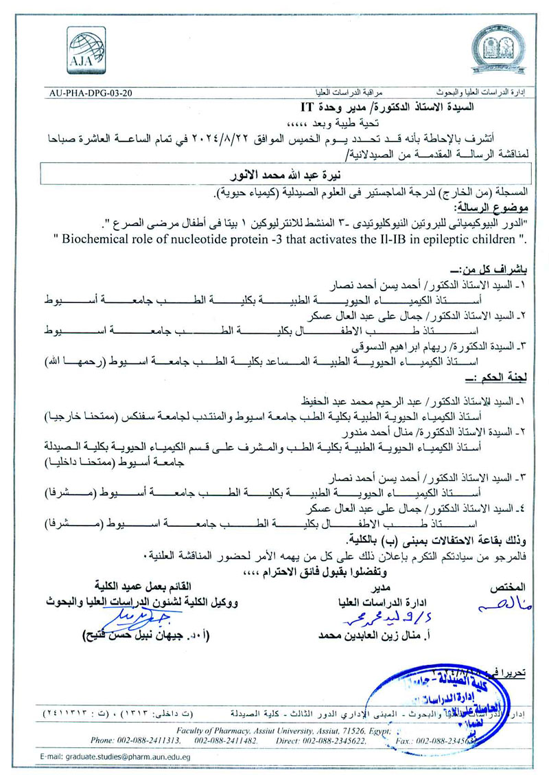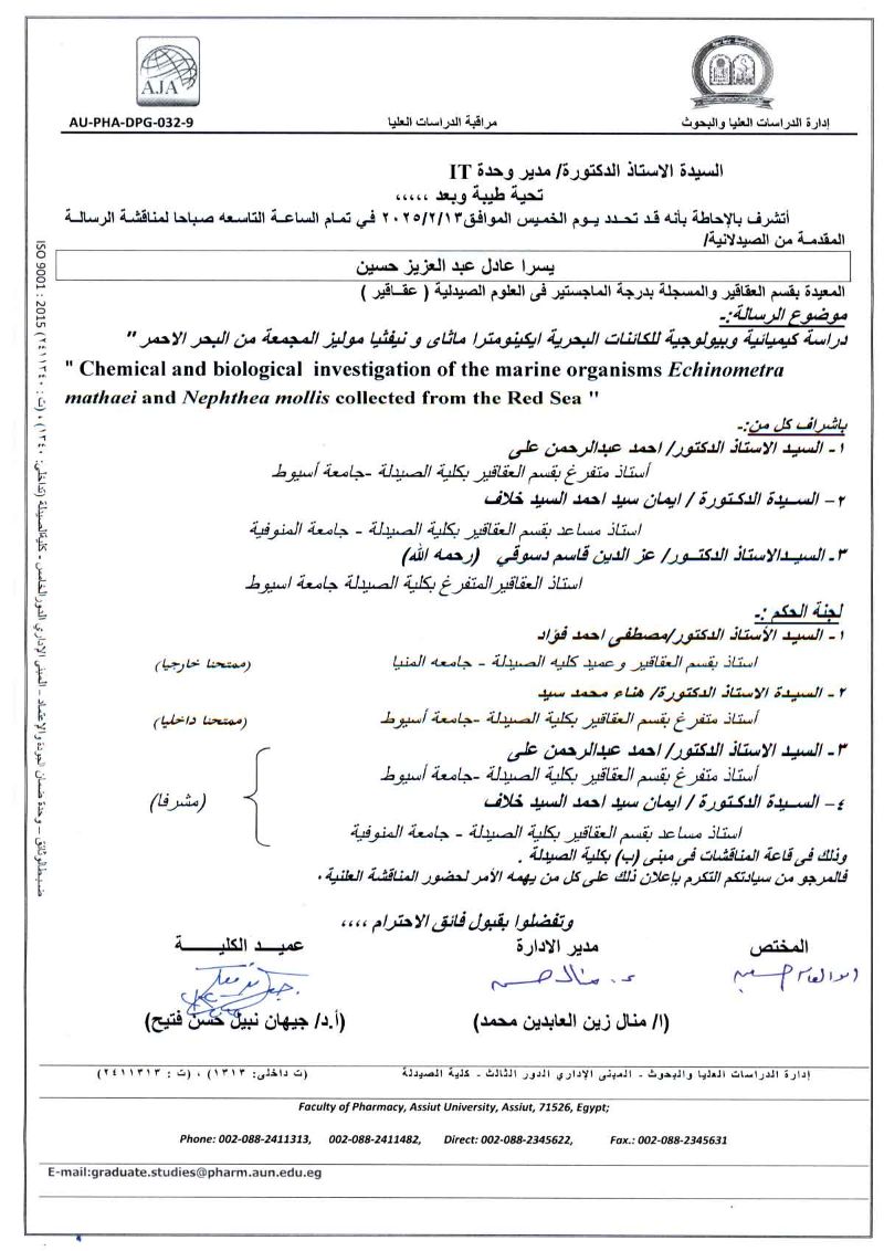 مناقشة الرسالة المقدمة من السيد الماجستير / خالد محمد حسن للحصول على درجة دكتوراه الفلسفة فى العلوم الصيدلية (كيمياء حيوية ) من الخارج يوم الخميس الموافق 10/ اكتوبر/2024