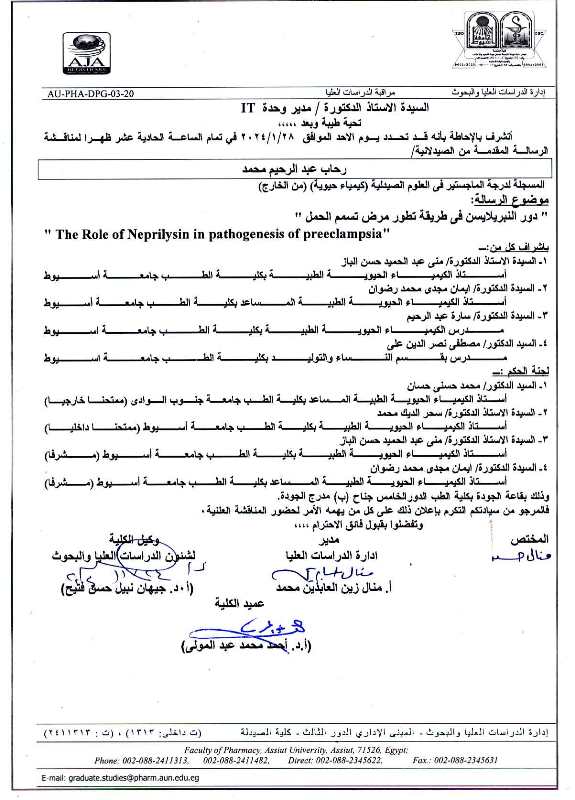 مناقشة الرسالة المقدمة من الصيدلانية / نورهان محمد حسين - المسجلة لنيل درجة الماجستير فى العلوم الصيدلية (كيمياء حيوية) من الخارج يوم الأحد 28 يناير 2024م