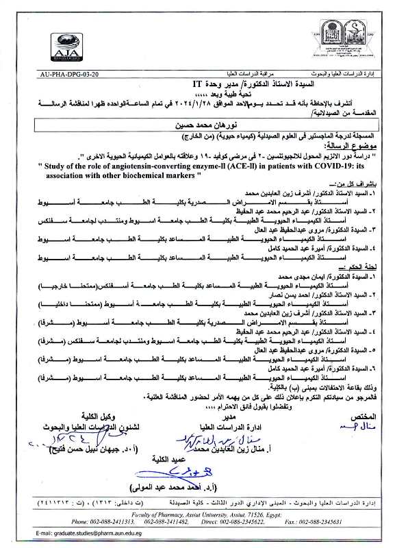 مناقشة الرسالة المقدمة من الصيدلانية / نورهان عصام الدين فراج- المسجلة لدرجة الماجستير فى العلوم الصيدلية (كيمياء حيوية) من الخارج يوم الثلاثاء الموافق 27 فبراير 2024